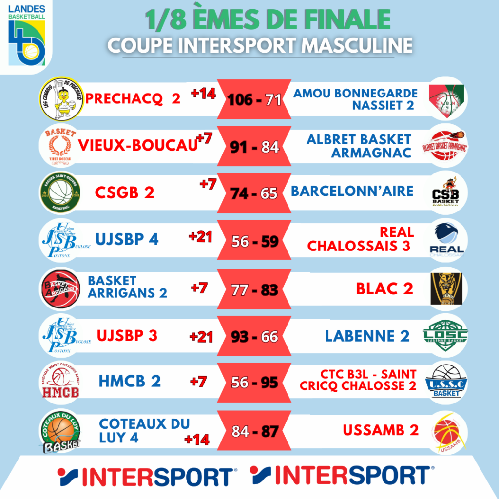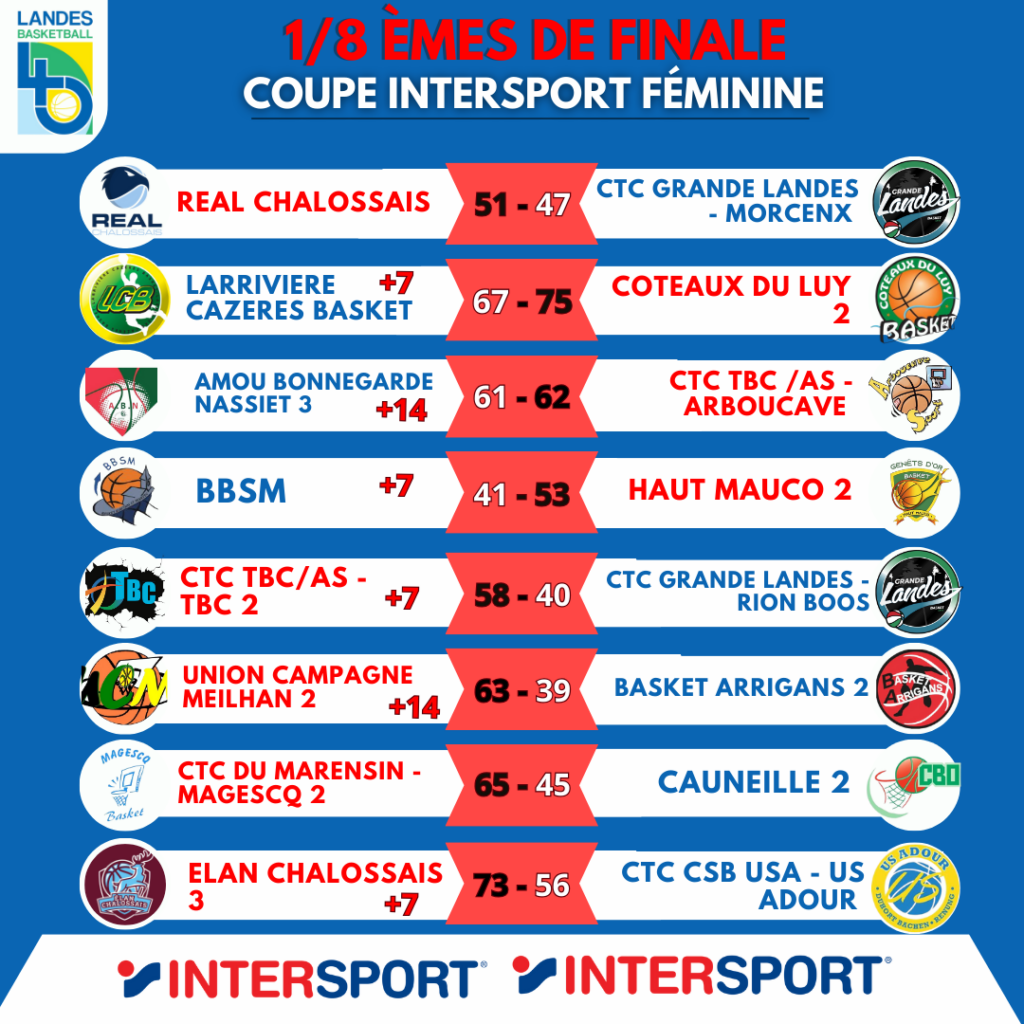 Retrouvez ci-dessous les résultats des 1/8èmes de la Coupe Intersport féminine et masculine disputés Vendredi soir !