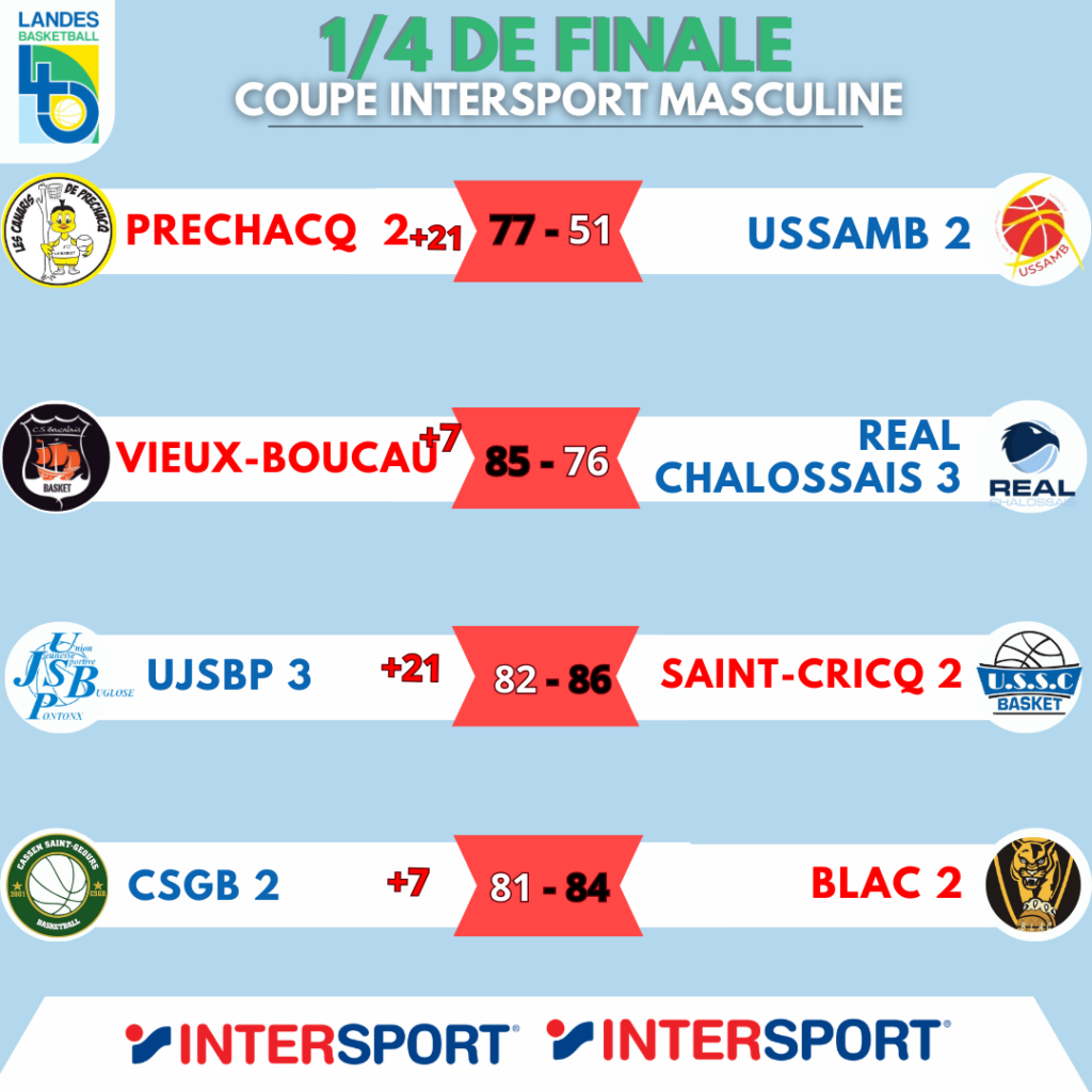 Retrouvez ci-dessous les résultats des 1/4 de finales de la Coupe Intersport féminine et masculine !